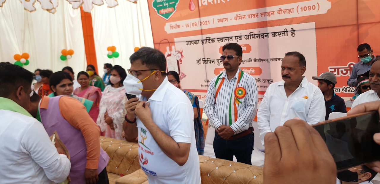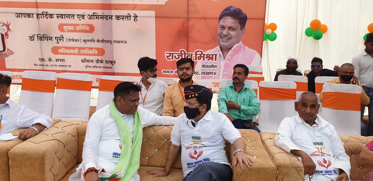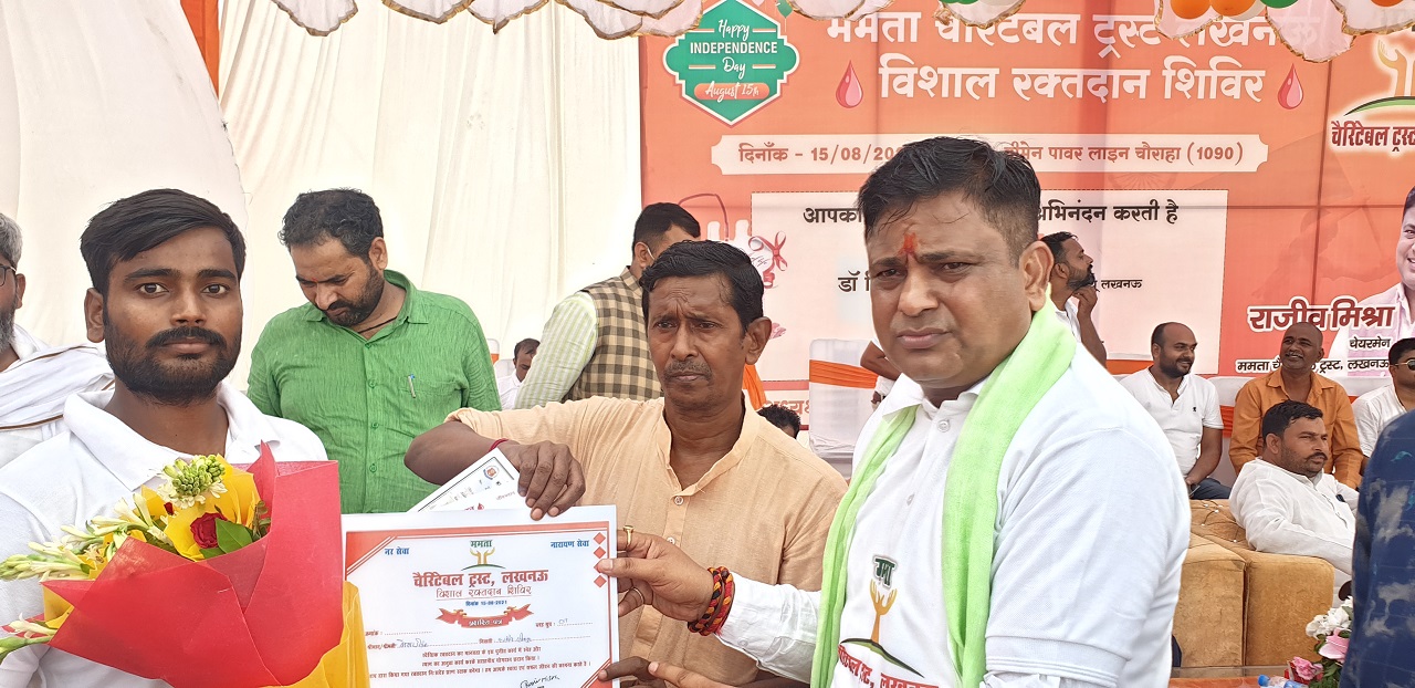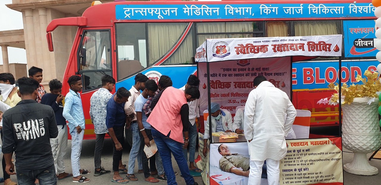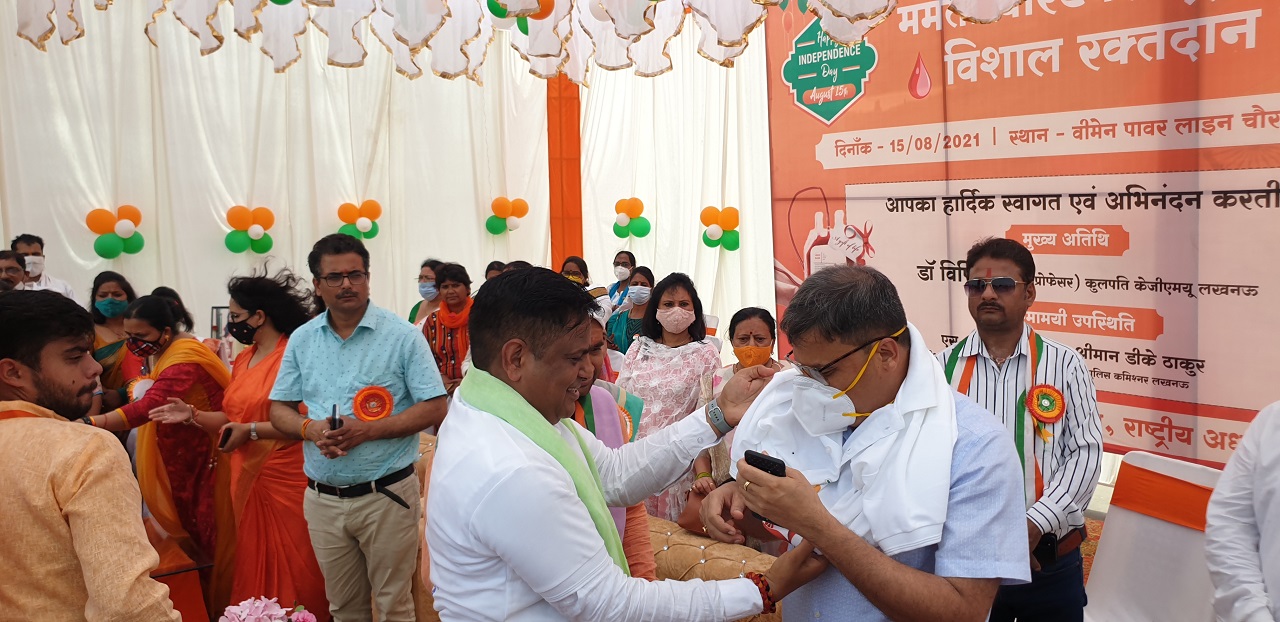 75वें स्वतंत्रता दिवस के अवसर पर केजीएमयू न ममता चैरीटेबल ट्रस्ट के संयुक्त तत्वाधान में रक्तदान शिविर का आयोजन किया। शिविर में सिटी मांटेसरी स्कूल के प्रबंधक डॉ. जगदीश गांधी, केजीएमयू के कुलपति डॉ. विपिन पुरी, लखनऊ पुलिस कमिश्नर डीके 'ठाकुर एवं उत्तरी रेलवे के डीआरएम एसके सपरा ने लोगों को रक्तदान के' लिए प्रोत्साहित किया। रक्तदान शिविर में उत्तराखंड जूता अखाड़े के महामंडलेश्वर . यतीन्द्र गिरी महाराज एवं विवेकानंद नैमिषारण्य के विद्या चेतन महाराज भी मौजूद थे। कुलपतिं डॉ. पुरी ने कहा कि एक रक्तदान 3 मरीजों का जीवन बचाता है। रक्तदान महादान है। चिविवि ट्रांसफ्यूजन विभाग की लिभागाध्यक्ष डॉ. तूलिका चंद्रा बताया कि कौन-कौन से लोग रक््तदात कर सकते हैं। रक्तदान से शरी को क्या लाभ होता है। इस अवसर पर डीआरएम श्री सपस ने भी रक्तदान किंयां। शिविर में 201 रक्तदाताओं ने रक्तदान किया।